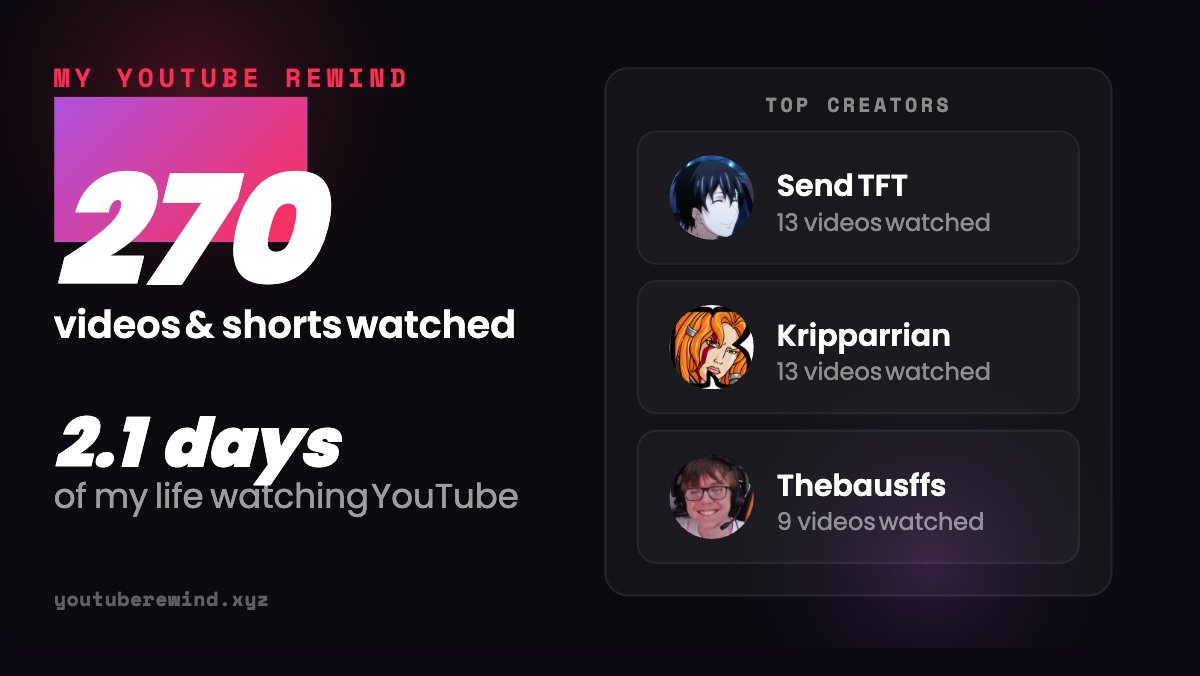 Youtube used to show you a ton of aggregate stats on your watch history, but removed it a while back. I built a Youtube Rewind (link in next tweet) that you can run to see lifetime stats including: - Videos Watched - Top Channels...