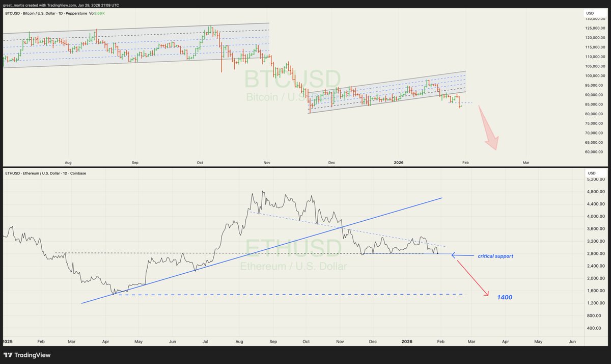 Bitcoin Ethereum updates ✨ Both textbook patterns are playing out as predicted. Ethereum is dead on critical support; a breach here and the $1,400 level comes into play. ...