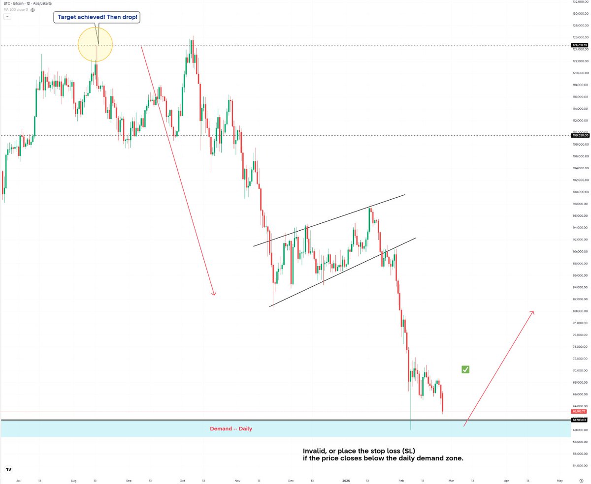 $BTC update Bitcoin Buying opportunity - high risk! I’m waiting for price to revisit the daily demand zone before looking for a short-term buying opportunity.