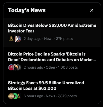 Currently trending on X: - Bitcoin dives below $63k amid EXTREME investor fear - Strategy Faces $9.5B Unrealized Bitcoin loss...