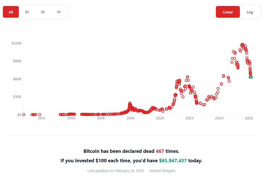 467 Bitcoin obituaries. Every single one was written by someone smarter than you. Every single one was wrong. Your PhD, your Bloomberg terminal, your risk models... none of it matters if you can't ignore the noise.
