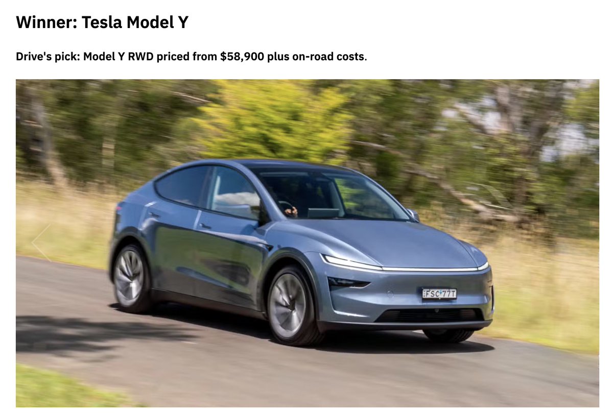 EXCITING UPDATE 🚨 TESLA MODEL Y RWD CLAIMS 2026 DRIVE CAR OF THE YEAR AS BEST ELECTRIC VEHICLE UNDER $60K 🔥 Here’s what sealed the victory for the Tesla Model Y RWD 🍿 ✅ Top-tier software delivering an effortless EV ownership experience, with powerful processing, intuitive navigation, seamless app integration, and over-the-air updates ...
