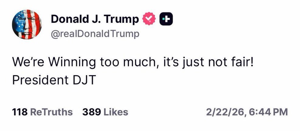 💥BREAKING: President Trump says. “We’re winning too much. It’s just not fair.”